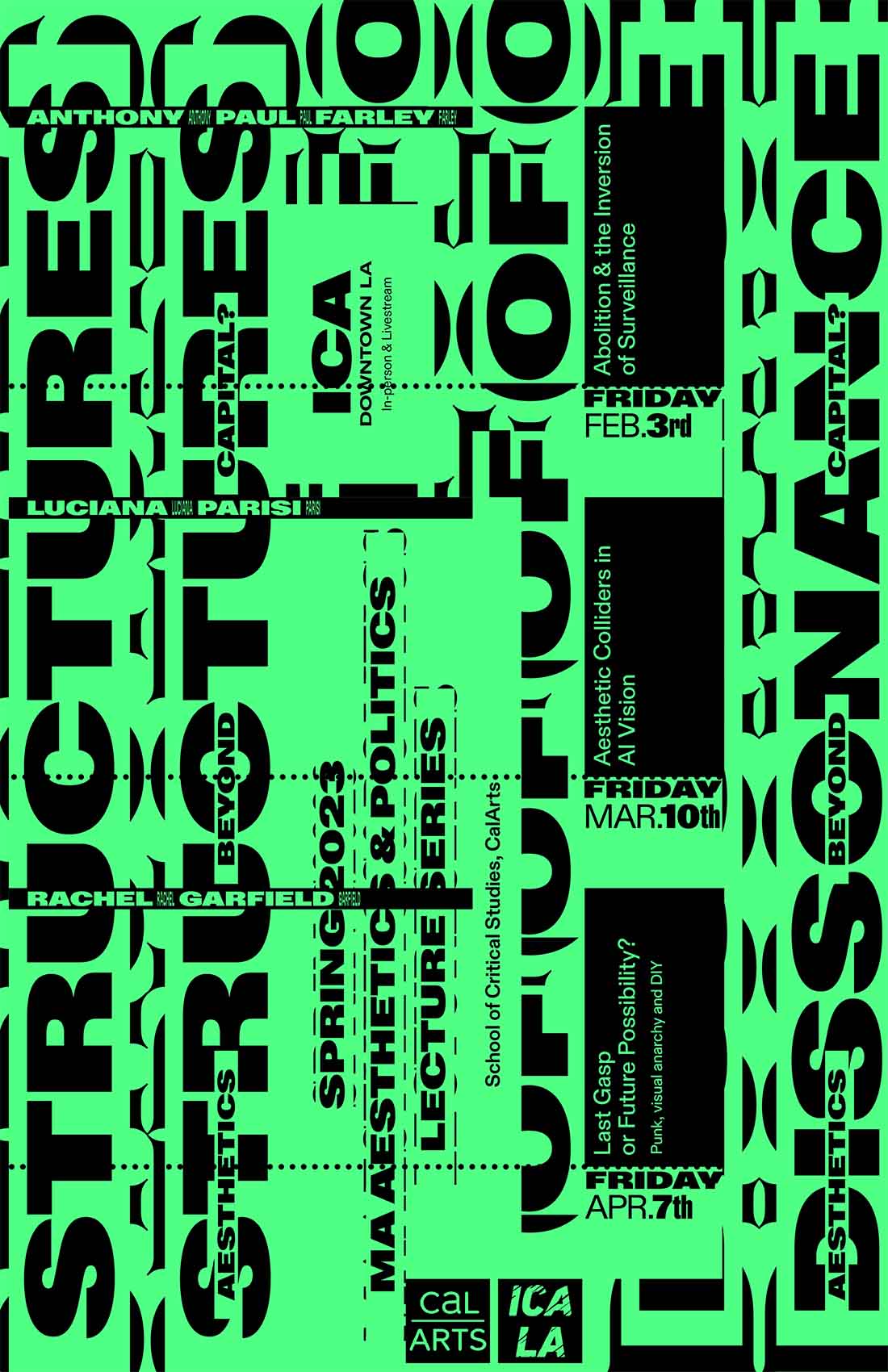 Identity and poster design for CalArts School of Critical Studies' 2023 Spring Lecture Series: Structure of Dissonance. Made at Office of Communication at CalArts