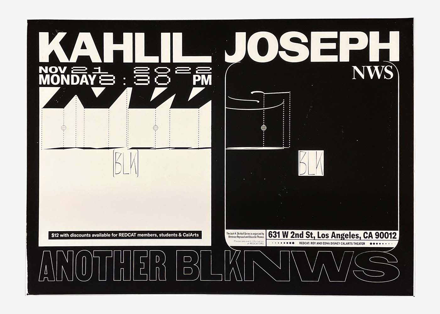 A poster designed for Kahlil Joseph’s solo exhibition Another BLKNWS at REDCAT. The exhibition’s centerpiece, the conceptual news program BLKNWS, is presented as a dual-screen video installation that plays in a continuous loop. The original visual identity and graphic design of BLKNWS were created by Hassan Rahim.