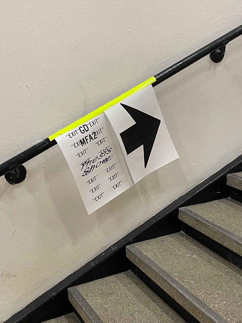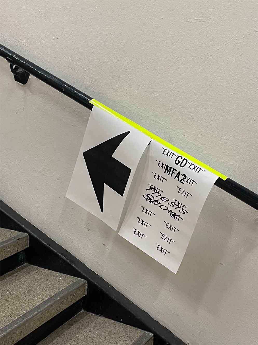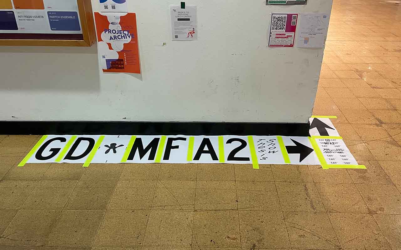 The identity design for 2023 CalArts Graphic Design MFA2 Thesis Show: EXIT. Designed and installated within limited time and budget. Using two different width of Highway Gothic and basic 11' x 17' to accommodate various viewing scenarios. Poster designed with Zhen Lu.
