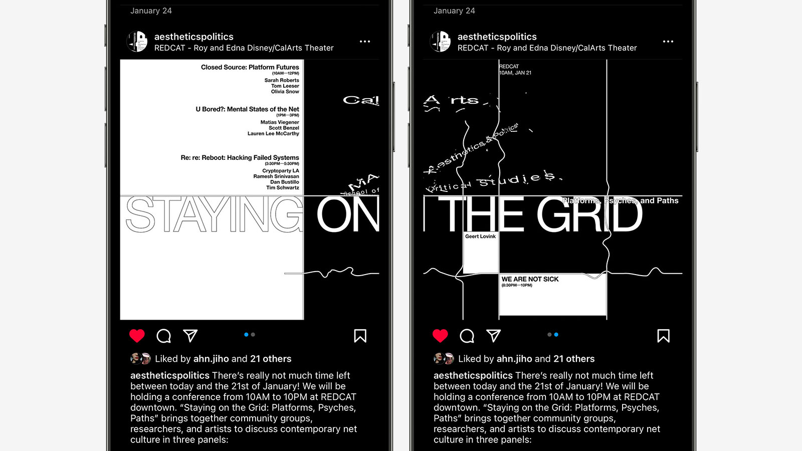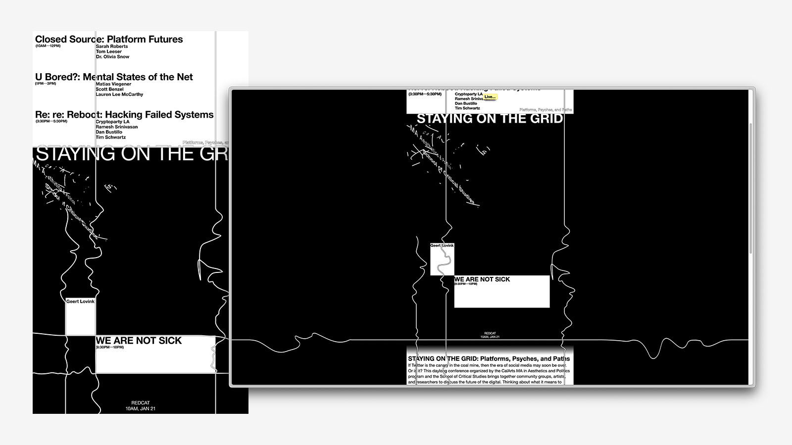 Identity design collaboration with Maisa Imamović for Staying On The Grid, a conference about net culture hosted by Aesthetics and Politics program at CalArts. Web developed by Maisa Imamović