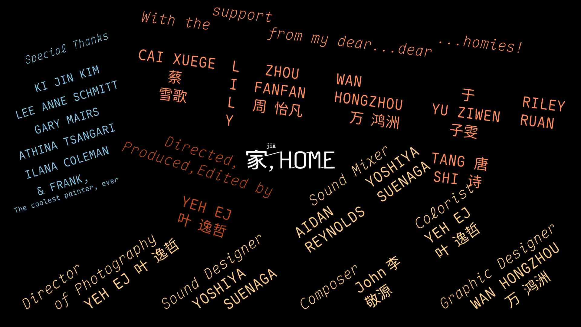 Key Visuals for EJ Yeh's thesis film: Jia, Home, including original bilingual Lettering, poster and motion treatment for ending credits.